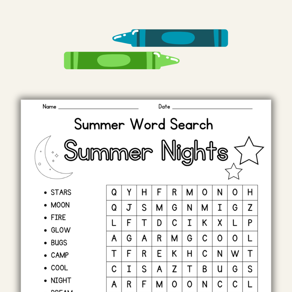 Enhance your end-of-year lesson plans with our Summer Word Search Vol. 4! Perfect for keeping students engaged as the school year winds down. Each of the five themed puzzles—Summer Nights, Summer Colors, Amusement Park, Cycling, and Summer Activities—features 12 words to find, arranged in straightforward vertical and horizontal lines (no diagonals!). Complete with coloring elements for added creativity, these puzzles offer a seamless blend of fun and learning.